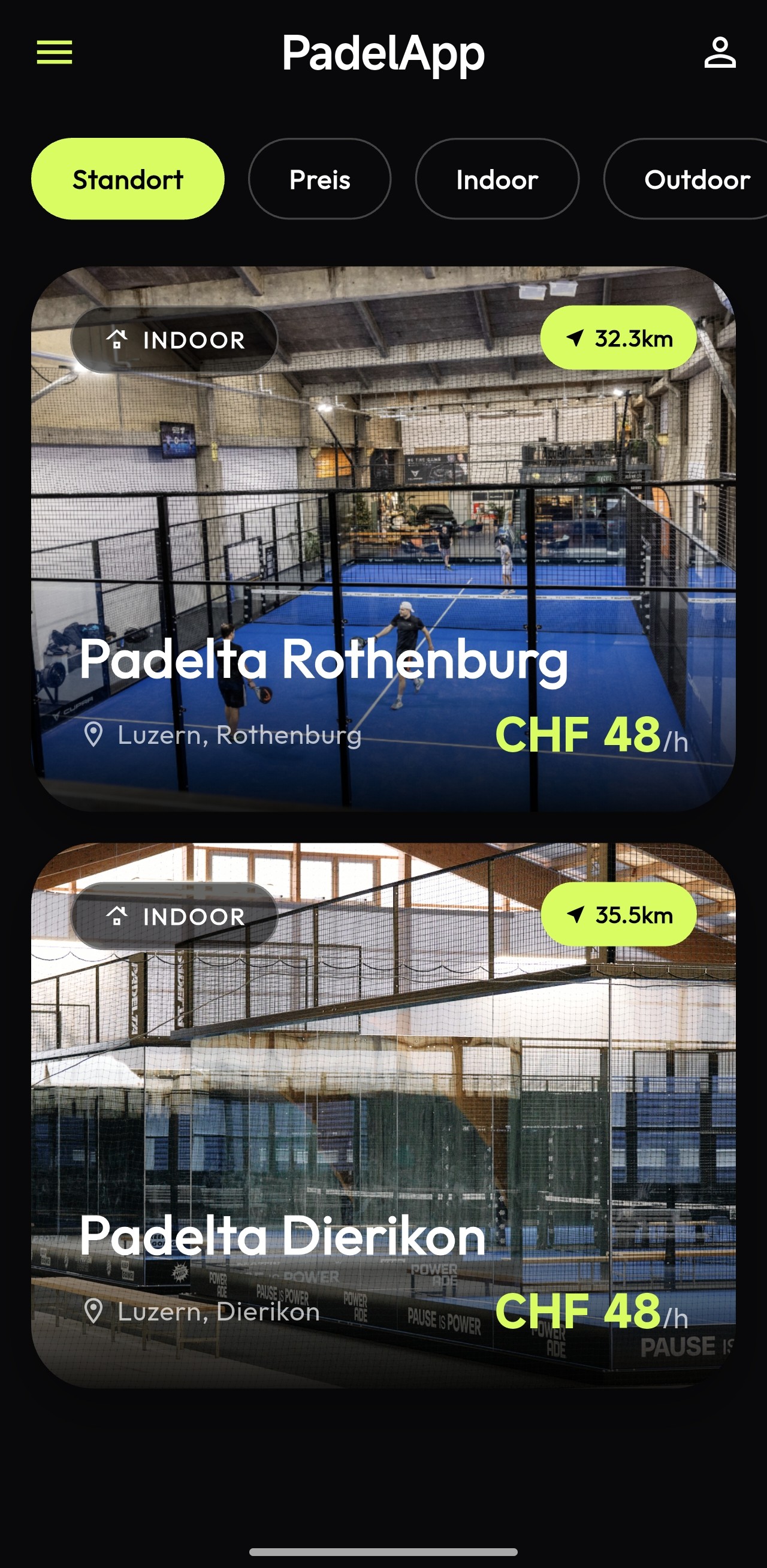 Courts werden automatisch nach Entfernung sortiert. Integrierte Google Maps Navigation direkt zum Standort.